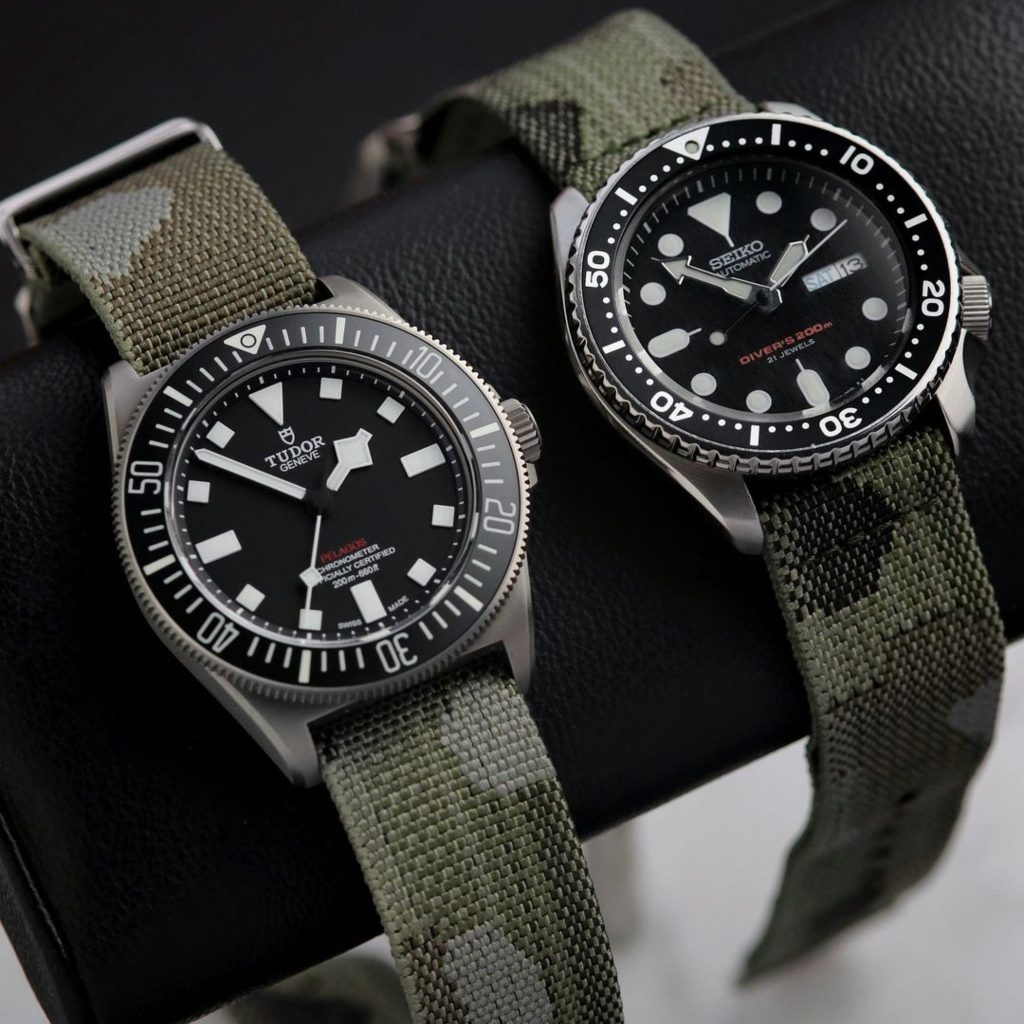 Unlike standard printed patterns, our camo straps are jacquard-woven on a special loom using five pre-dyed yarns. This results in ultra-fine detailing with no harsh edges, and the camo tones still shift beautifully under infra-red. Combined with distressed hardware in silver, black, or bronze, each strap adds rugged character to your watch.